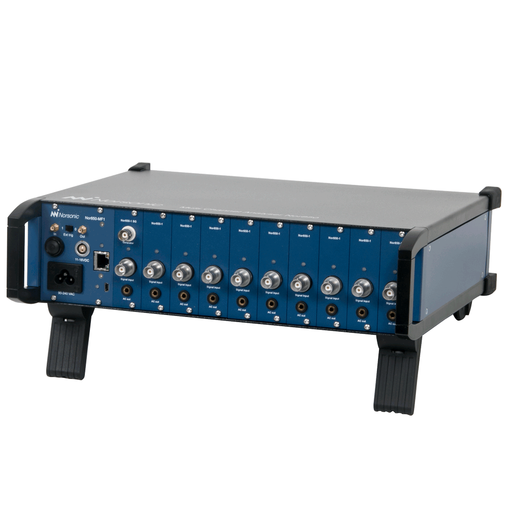 The Nor850-MF1 rack is delivered with a selectable number of measurement channels, and may be upgraded with additional channels as the needs grow. Multiple racks may be used in the same system alternatively in a mix with Nor140 or Nor150 Sound level meters as additional frontends. Optionally, selected channels may be fitted with signal generator outputs.